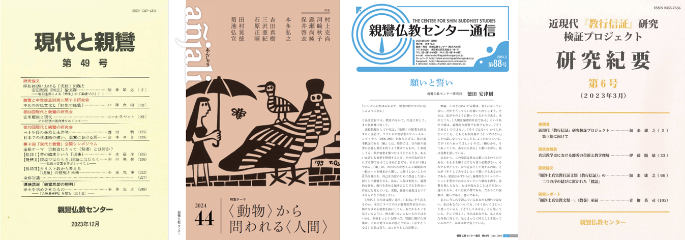 研究誌として、研究員の論文や連続講座「親鸞思想の解明」の講義録、当センターが実施する研究・交流事業の内容を網羅した『現代と親鸞』(年2回)と、近現代『教行信証』研究検証プロジェクトの成果を公開する『研究紀要』(年1回)を刊行しております。なお、当センターの研究誌に掲載した論文は、すべてJ-STAGEで公開しております。
